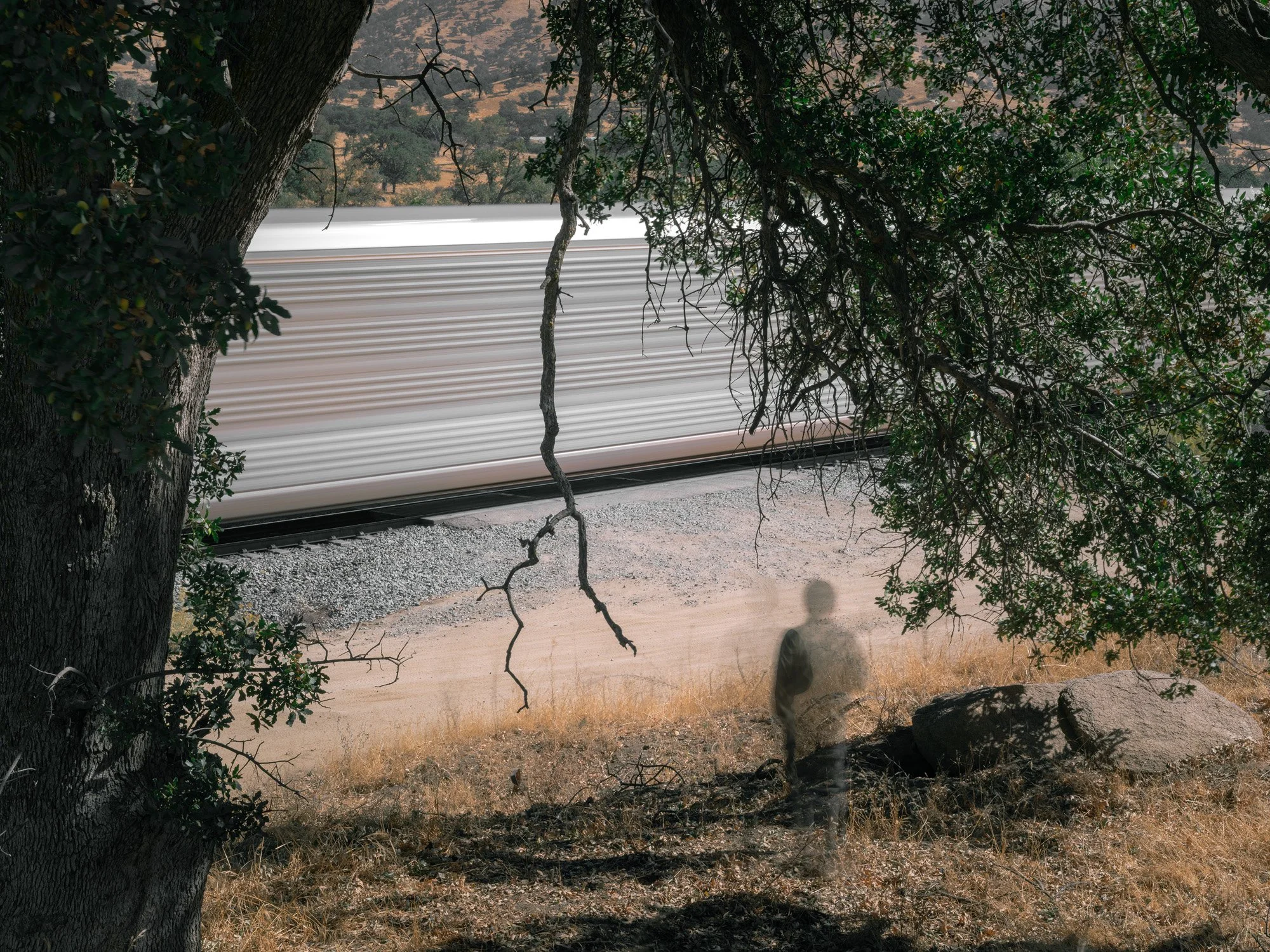 在这一摄影项目中,我在美国第一与第二条横贯大陆铁路、废弃的中国城遗址、以及国境线拍摄模糊的自己。这些影像既是对被遗忘者的代言,也是对历史抹除的反抗。